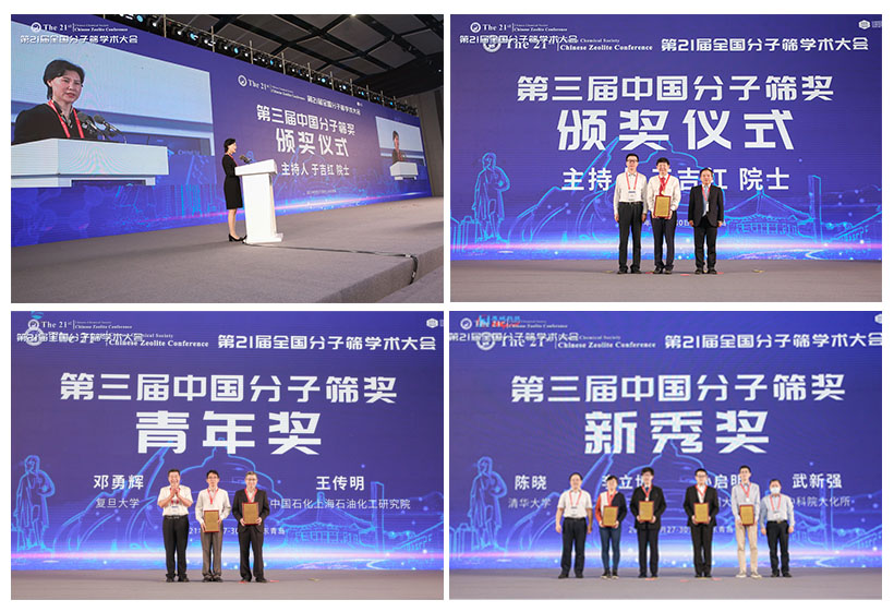 為獎勵我國分子篩領域科學工作者的學術成就和突出貢獻,促進我國分子篩學科的發展,中國化學會分子篩專業委員會設立中國分子篩獎,包括終身成就獎,成就獎,青年獎和新秀獎。在本屆會議上舉行了第三屆中國分子篩獎頒獎典禮,于吉紅院士主持第三屆中國分子篩獎頒獎儀式,劉中民院士,謝在庫院士,韓布興院士等為獲獎的的肖豐收教授(浙江大學),王傳明(中國石化上海石油化工研究院),鄧勇輝(復旦大學),陳曉(清華大學),李立博(太原理工大學),孫啟明(蘇州大學),武新強(中科院大化所)等頒發了獎牌和獎狀。